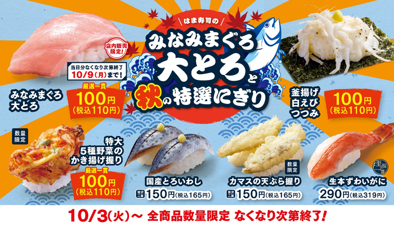 株式会社はま寿司(代表取締役社長:遠藤 哲郎 本社:東京都港区)が展開する100円寿司チェーン「はま寿司」は、10月3日(火)から、「はま寿司のみなみまぐろ大とろと秋の特選にぎり」を全国の店舗で開催します。