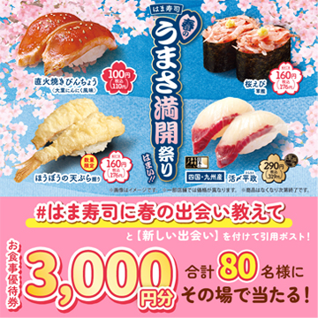抽選で合計80名様にはま寿司で使えるお食事優待券3,000円分をプレゼント!